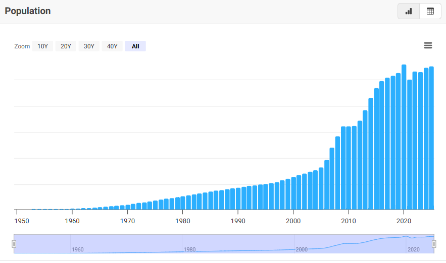 Qatar is a small nation with a total population of about 3.12M. Like many Gulf States the majority of the population is (94%) expats from South Asia and the broader Middle East. There is also an increasing about of expats from Europe and North America (5%-8%). Qatari citizens are only about 360,000 and non-Qatari citizens about 2.76M. The median age is 33 years and 97% of residents live in Doha and Lusail. Since 2000, the population has grown 428% and average annual growth about 7.1%. The population grew 2.2% and 7.6% in 2025 and 2024. The growth is driven mainly by migration given fertility rates are below replacement. Given the economic growth and government easing of immigration controls the population is expected to continue to grow (4.16M by 2050). An example of this easement is the recent lowering of the investor visa requirement to just $200,000 from $1M.