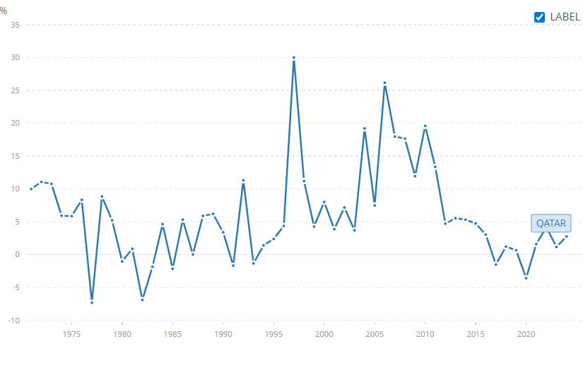 Total GDP is about $180B with GDP per capita of about $60,000. Q2 2025 GDP grew 1.9% down from 3.4% in Q1 2025. The Q2 growth was driven by non-oil sectors (up 3.4%) specifically agriculture (15.8%), tourism (13.4%), and retail (8.8%). According to the IMF, GDP is expected to grow 2.9% and 6.1% in 2025 and 2026. The 2025 forecast is based a stable LNG market and continued growth in non-oil sectors (tourism, tech, construction etc). The 2026 forecast is based on the expansion of the North Field output and steady growth in the logistics and tech sectors. GDP grew 1.9% and 2.7% in 2023 and 2024. From 2005-2025, GDP grew on average about 4.2% annually with a peak of 14% in 2006 and low of 3.6% in 2020 (Covid-19). Debt per GDP was about 40% in 2024 and is expected to decline to 30% by 2026. The GDP breakdown is about 34% energy, 8.9% services, 7.4% manufacturing, 12% finance/tech, and 11.8% constructions. Qatar has a trade surplus of $4B and top export partners are Japan, South Korea, India, and UAE.