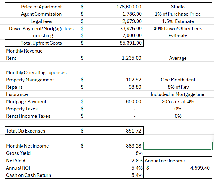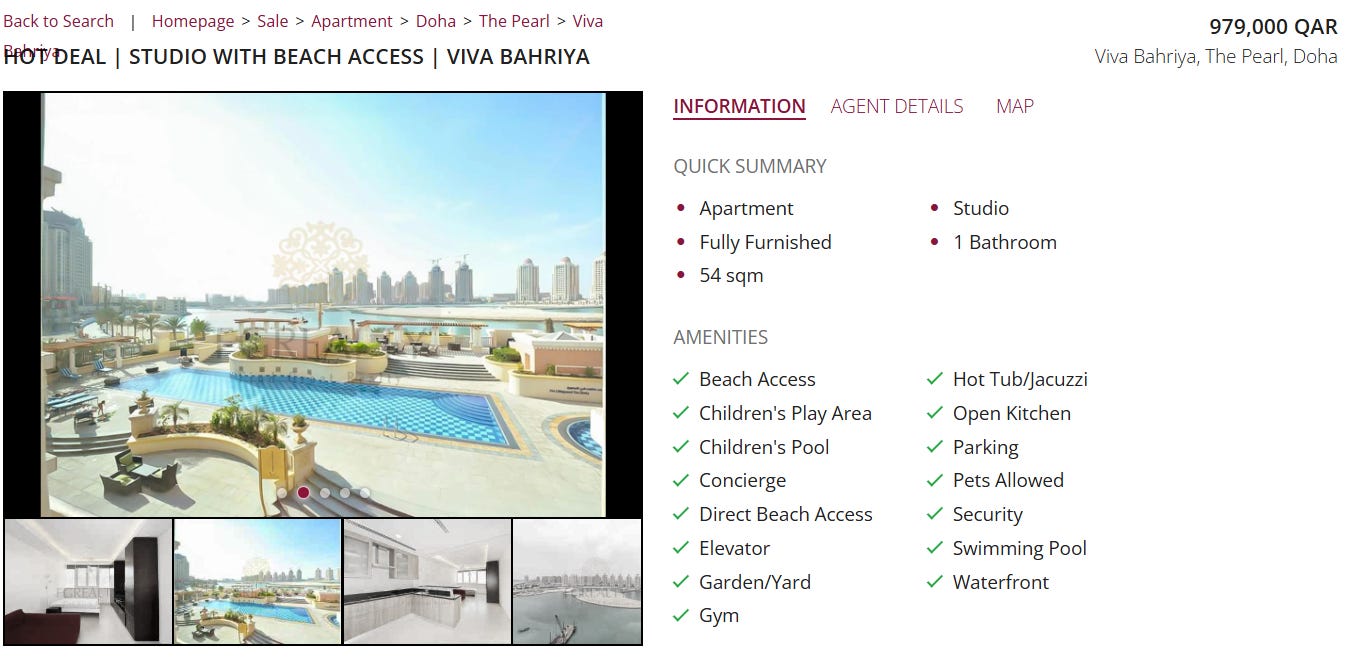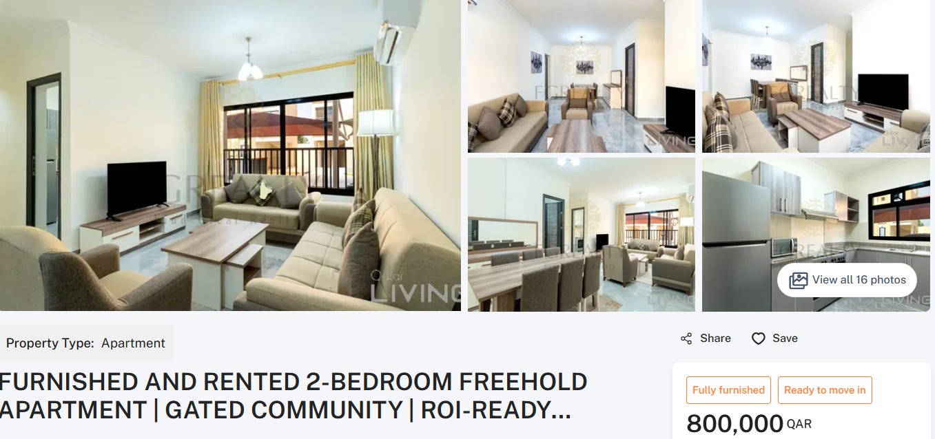 Before we get into the numbers, it’s worth noting two things. First non-residents can get mortgages in Qatar, and the terms are pretty good. You can get more information here. And second, Qatar has no income tax, property tax, capital gains tax or inheritance tax.