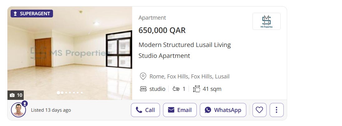 The estimates are conservative, and the studio is in a more affordable area in Lusail called Fox Hills. For non-residents you have to put down 40% and loan terms are 20 years.